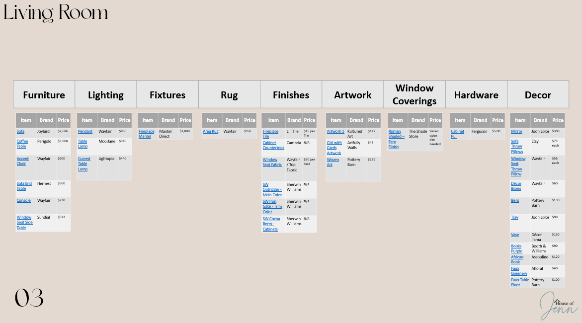 A linked itemized spreadsheet featuring the products used in each space, creating an effortless process for purchasing.